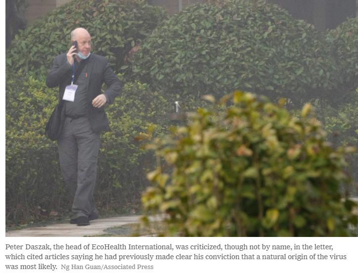 Without naming him, the letter criticized Peter Daszak, an expert in animal diseases and their connection to human health, who is the head of EcoHealth International. The letter linked to articles about Dr. Daszak and said he had previously stated his conviction that a natural origin of the virus was most likely.