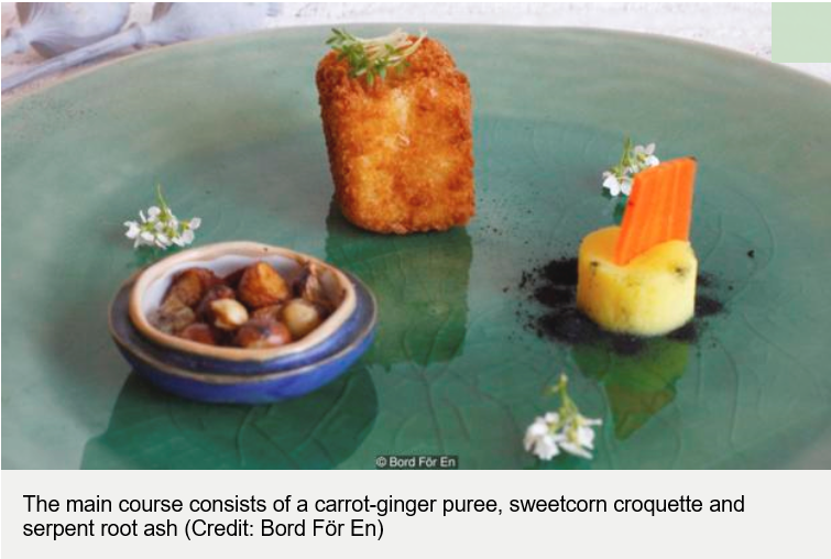 The first course is råraka, Swedish-style hash browns with thick smetana sour cream, seaweed caviar and sorrel. It’s followed by “Black & Yellow”, a plating of yellow carrot-ginger puree, browned hazelnut butter, sweetcorn croquette (redolent of Spanish tapas) and serpent root (Spanish salsify) ash.