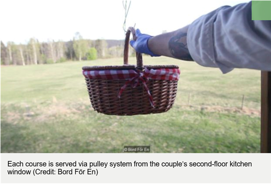 Each evening at 19:00, their solo customer takes a seat at the table and eats alone to the sounds of rustling trees and chirping birds. There are no wait staff and no direct human contact. To deliver the food safely, a red and white gingham-frill basket is attached to a rope and served from Karlsson’s second-floor kitchen window via a pulley system fashioned using an old bicycle wheel to their guest sitting 50m away.