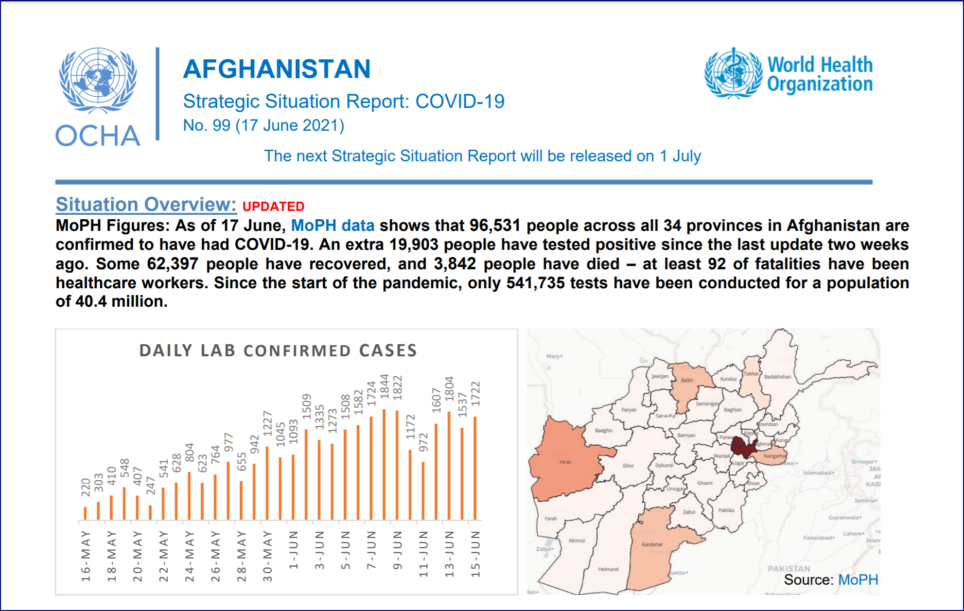 MoPH Figures: As of 17 June, MoPH data shows that 96,531 people across all 34 provinces in Afghanistan are confirmed to have had COVID-19. An extra 19,903 people have tested positive since the last update two weeks ago. Some 62,397 people have recovered, and 3,842 people have died – at least 92 of fatalities have been healthcare workers. Since the start of the pandemic, only 541,735 tests have been conducted for a population of 40.4 million.